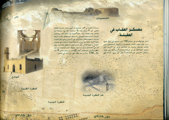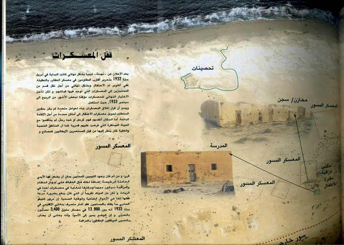 ولعل من أبرز المعسكرات في العهد الايطالي ” معسكر العقاب في العقيلة ” وفي هذا المعرض مخطط متكامل لتحصيناته وأسواره، والجامع الموجود بداخله، والمقابر ، والمخازن، ومكتب المراقبة، والمدرسة ، وقد تم قفل هذه المعسكرات ما بين سنتي 1932 – 1933.