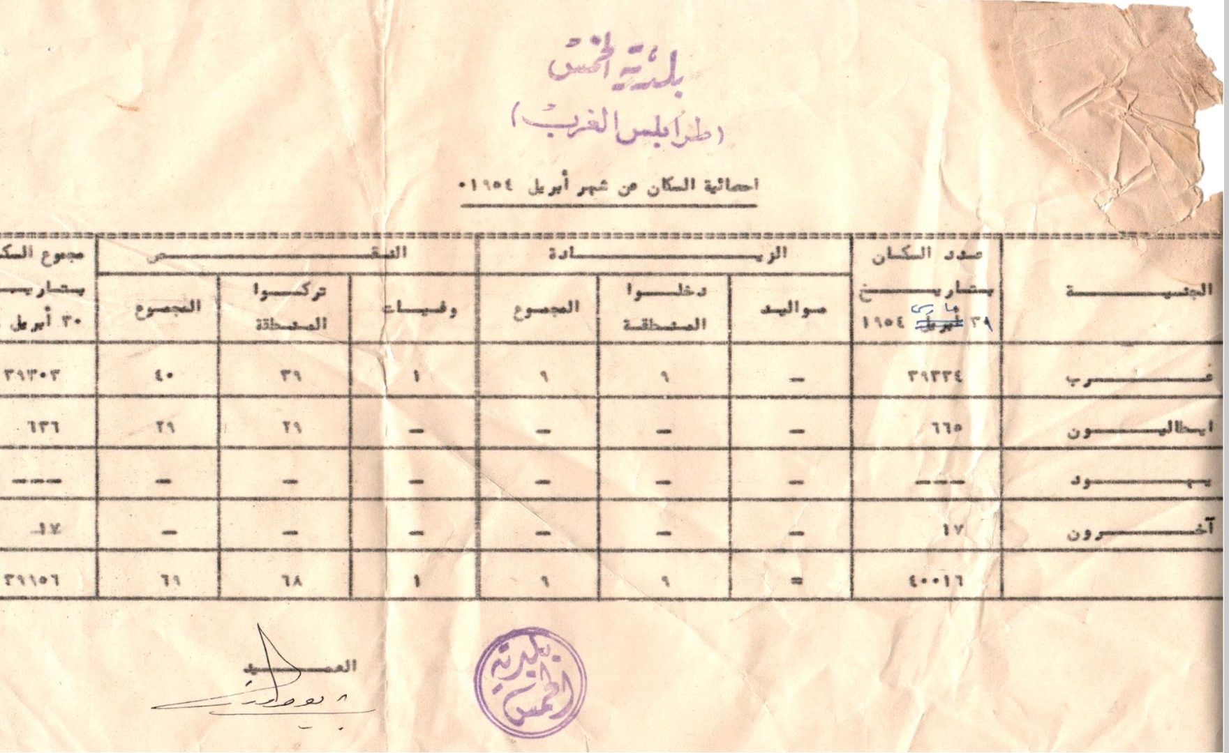 العثور على وثيقة إحصائية سكان بلدية الخمس خلال شهر أبريل 1954م.