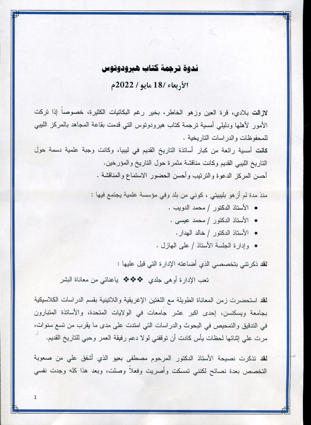 لازالت بلادي ، قرة العين وزهو الخاطر ، بخير رغم البكائيات الكثيرة ، خصوصاً إذا تركت الأمور لأهلها ودليلي أمسية ترجمة كتاب هيرودوتوس التي قدمت بقاعة المجاهد بالمركز الليبي للمحفوظات والدراسات التاريخية.