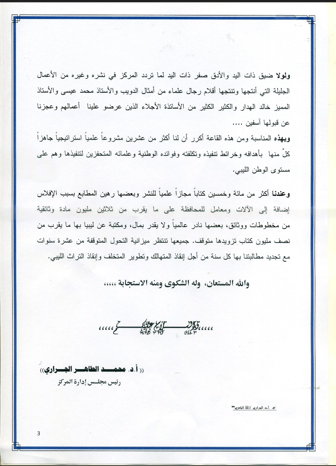 وعندنا أكثر من مائة وخمسين كتاباً مجازاً علمياً للنشر وبعضها رهين المطابع بسبب الإفلاس إضافة إلى الآلات ومعامل للمحافظة على ما يقرب من ثلاثين مليون مادة وثائقية من مخطوطات ووثائق ، بعضها نادر عالميا ولا يقدر بمال ، ومكتبة عن ليبيا بها ما يقرب من نصف مليون كتاب تزويدها متوقف . جميعها تنتظر ميزانية التحول المتوقفة من عشرة سنوات مع تجديد مطالبتنا بها كل سنة من أجل إنقاذ المتهالك وتطوير المتخلف وإنقاذ التراث الليبي .
